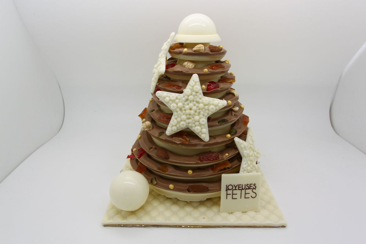 Crémeux léger aux trois chocolats noir Caraïbe 66%, lait Jivara 40%, blanc ivoire et biscuit chocolat.