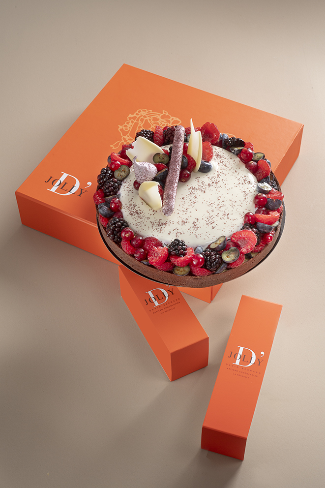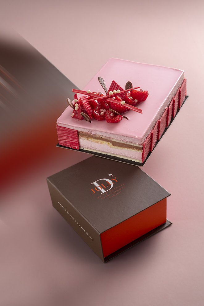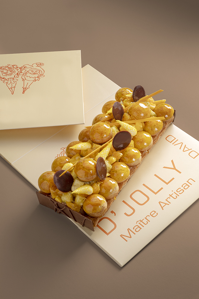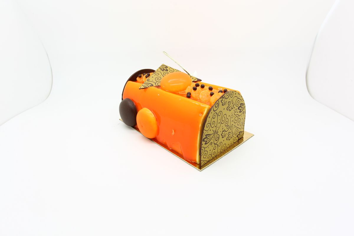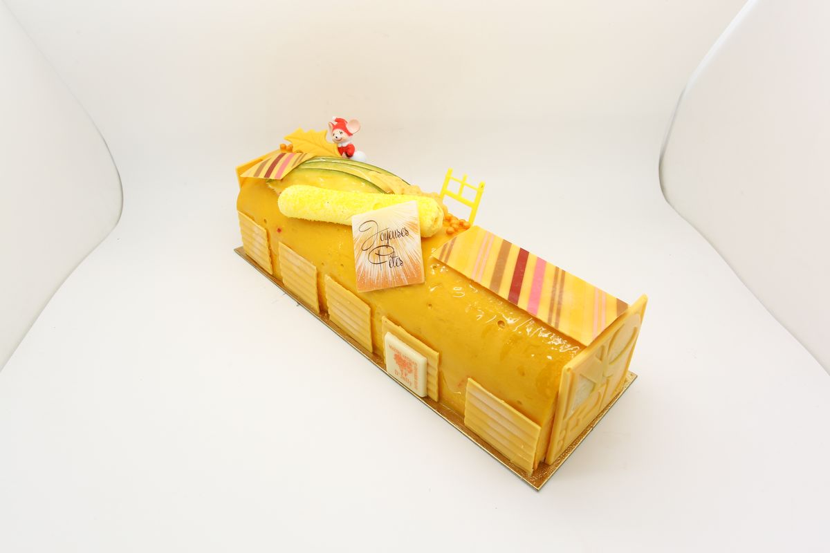 Crémeux fruit de la passion, biscuit joconde amande confit mangue de Kent et fruits de la passion, crémeux léger chocolat caraïbe 66% et biscuit chocolat.